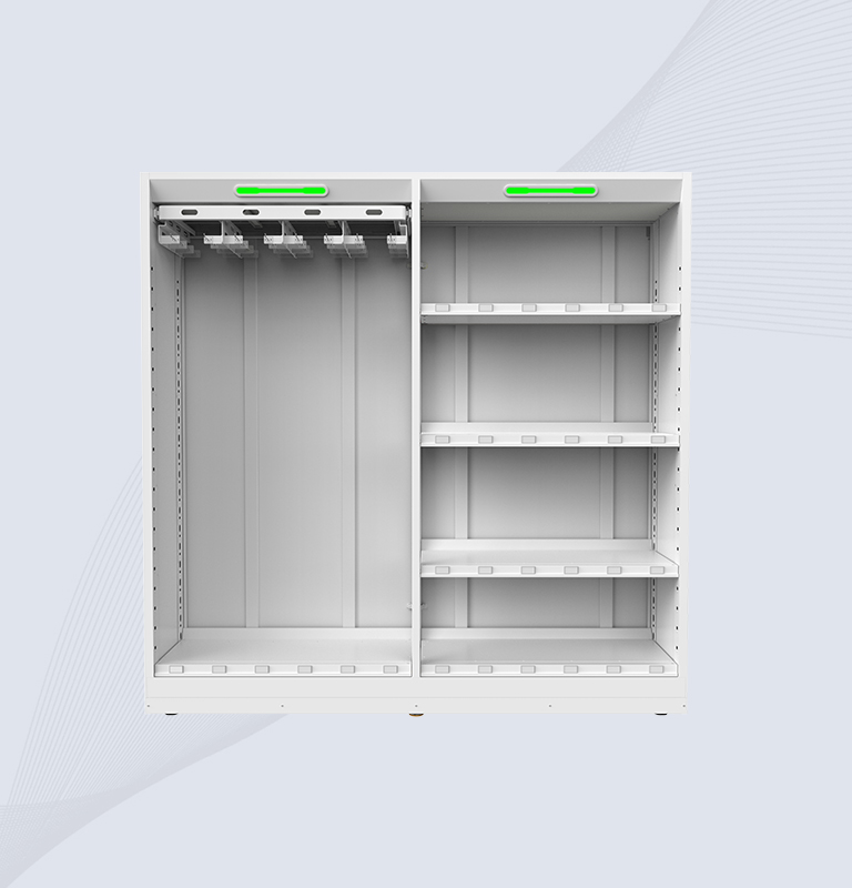 CK-H2A uses RFID with weight sensing to keep meds honest. Steel build, 4 shelves, holds 1,000+ items. Full shelf check takes about 10 seconds. Runs day and night at 0–60 °C, connects straight to ERP/WMS through the SDK.